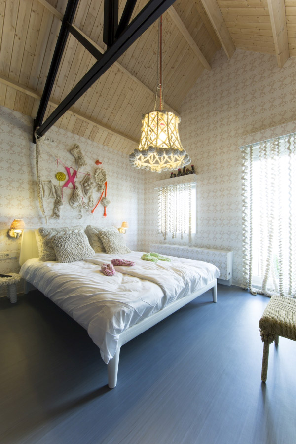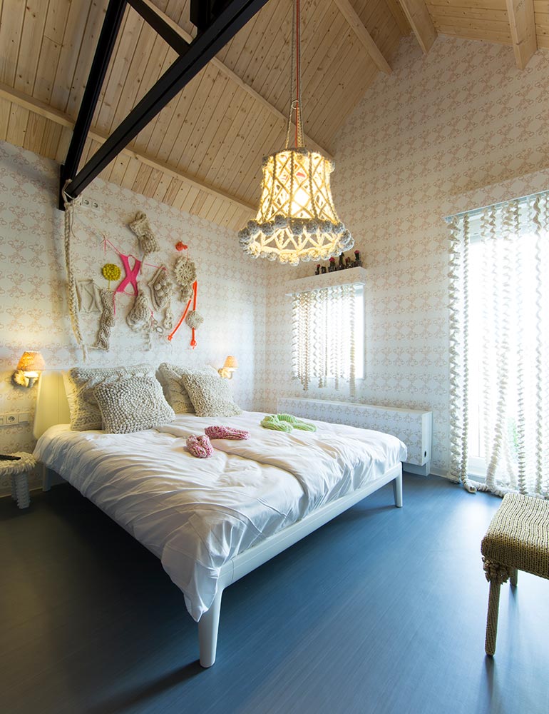 Room 33 Knitting by Caroline Evers <p>The knitting room is simply spectacular. Various knitting techniques are used for lamps, curtains and decorations. It&rsquo;s worth a stay in this room even for people who do not have a passion for knitting.</p> <p>The Loft Room has a double bed of 1.60 by 2.00 meters. An extra single bed can be placed for &euro; 37.50 per night.</p> <p>Click on the button &#39;Book a Loft Room&#39; for the availability of one of our loft rooms. If you would like to specifically book the room by Caroline Evers, please&nbsp;<a href="mailto:receptie@hotelmodez.nl">email</a> or <a href="http://tel:+31026440993">call</a> our reception.</p>