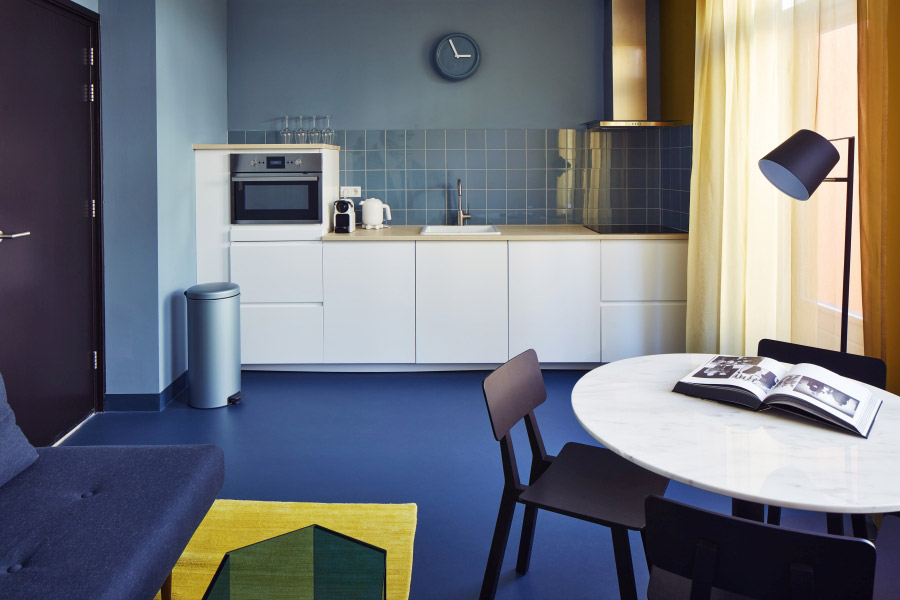 Studio 15C The bow tie <p>This single floor, masculine studio has a living room with designer sofa bed and a fully equipped kitchen. The bedroom offers a large Auping double bed. This studio is ideal for a longer stay or a stay with more than two guests. The design of the room is inspired by the fashion accessory, the bow tie. A cool, masculine design with lots of denim colors.</p> <p>Click on the &#39;Book a design studio&#39; button on the right to view the availability of our studios. If you would like to specifically reserve this studio,&nbsp;<a href="mailto:receptie@hotelmodez.nl">email</a> or <a href="http://tel:+31026440993">call</a> our reception.</p>