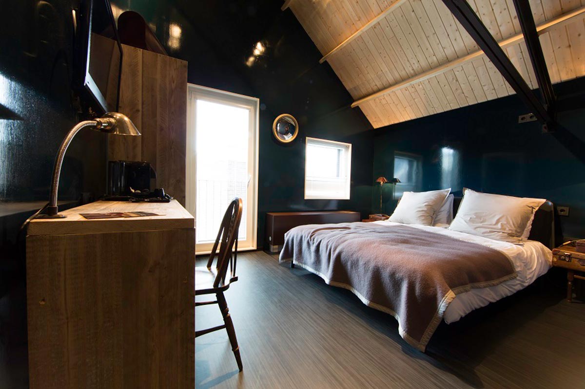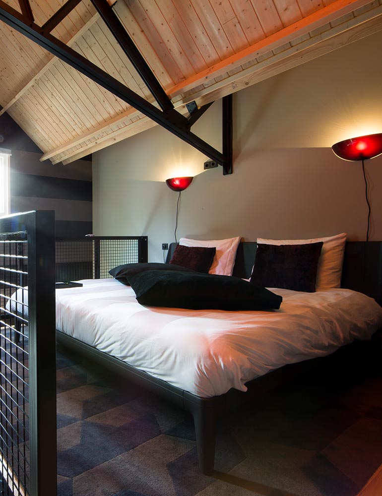Room 28 Sjaak Hullekes <p>Sjaak Hullekes has used the suitcase as the theme for the room, which you will find extensively in the vintage d&eacute;cor of the interior. A beautiful dark and elegant room where indirect lightning showcases Hullekes&rsquo; travel souvenirs on the wall. Even the bedside tables are made of old suitcases.</p> <p>The Loft Room has a double bed of 1.60 by 2.00 meters. An extra single bed can be placed for &euro; 37.50 per night.</p> <p>Click on the button &#39;Book a Loft Room&#39; for the availability of one of our loft rooms. If you would like to specifically book the room by Sjaak Hullekes, please&nbsp;<a href="mailto:receptie@hotelmodez.nl">email</a> or <a href="http://tel:+31026440993">call</a> our reception.</p>