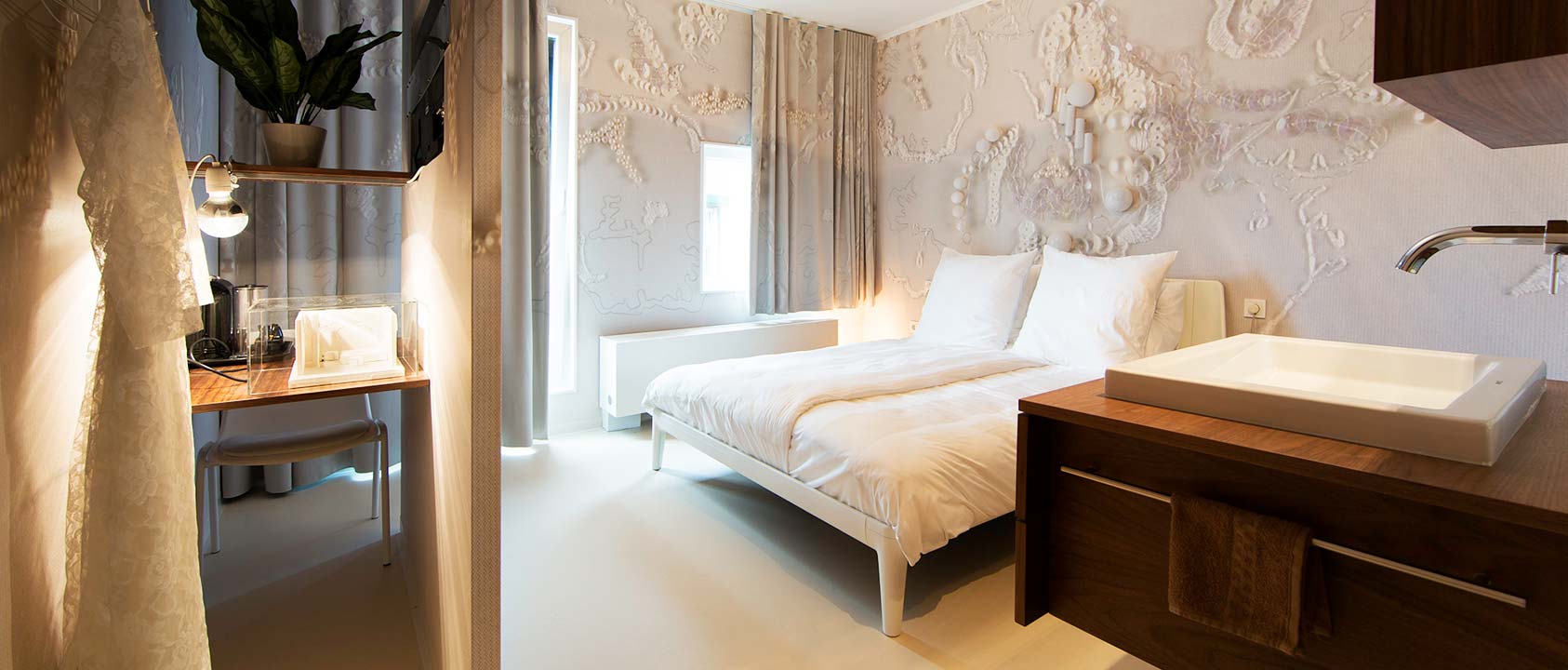 Room 27 Lace by Petra Vonk, Coppens Alberts and Klaartje Martens <p>See how different lace techniques are used in various materials in this room. The design is found not only in the wallpaper, curtains and floor, but there is also special lighting covered with lace. This creates a beautiful effect.</p> <p>In the Small Room there is a small double bed of 1.40 by 2.00 meters.</p> <p>Click on the &#39;Book a Small Room&#39; button on the right to view the availability of our small rooms. If you would like to reserve the room by Petra Vonk, Coppens Alberts and Klaartje Martens, please&nbsp;<a href="mailto:receptie@hotelmodez.nl">email</a> or <a href="http://tel:+31026440993">call</a> our reception.</p>