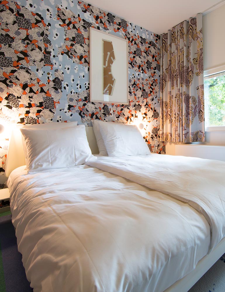 Room 8 Embroidery by Martine van 't Hul <p>This room is inspired by bridal embroidery. New forms of embroidery are integrated into a customized model of the room, which is then enlarged and reflected in both the wallpaper and curtains. Blown glass beads (made in collaboration with the National Glass Museum in Leerdam) are stitched on the headboard of the bed and provide a lovely finishing touch.</p> <p>The Comfort Room has a double bed of 1.60 x 2.00 meters.</p> <p>Click on &#39;Book a comfort room&#39; to see the availability of our Comfort Rooms. If you would like to specifically reserve the room by Martine van &#39;t Hul, <a href="mailto:receptie@hotelmodez.nl">email</a> or <a href="http://tel:+31026440993">call</a> our reception.</p>