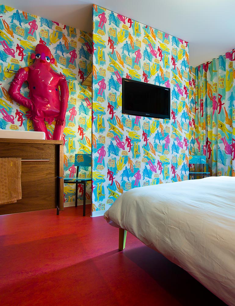 Room 3 Bas Kosters <p>Bas Kosters does not like being alone. With drawings on the wall and almost life-size dolls, he is assured of companionship. With its beautiful bright colors, it is a room that brings joy!</p> <p>The Comfort Room has a double bed of 1.60 x 2.00 meters.</p> <p>Click on &#39;Book a comfort room&#39; to see the availability of our Comfort Rooms. If you would like to specifically reserve the room by Bas Kosters, <a href="mailto:receptie@hotelmodez.nl">email</a> or <a href="http://tel:+31026440993">call</a> our reception.</p>