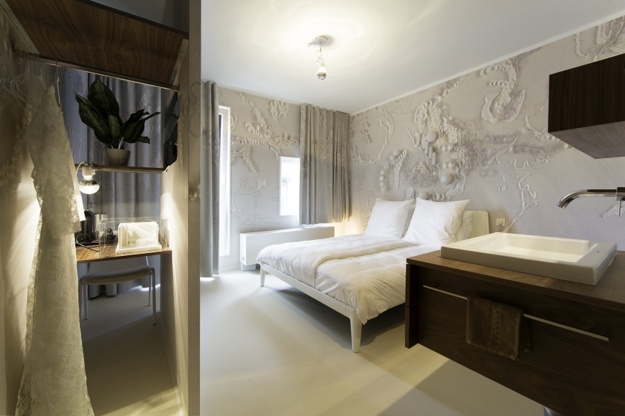 <p>Deze kamer is geïnspireerd op bruidsapplicaties. Nieuwe vormen van bruidsborduur zijn verwerkt in een op maat gemaakte maquette van de hotelkamer. Deze maquette is letterlijk uitvergroot in de kamer en is terug te vinden in zowel het behang als de gordijnen. In samenwerking met het Nationaal Glas Museum te Leerdam zijn glazen kralen geblazen. Deze zijn geborduurd op de achterwand van het bed.</p>