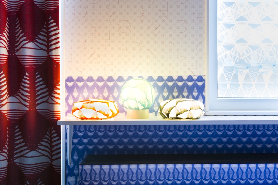 van echte planten die zij vervolgens gefotografeerd heeft. In de kamer hangt een indrukwekkende lamp, ontworpen door Paula Arntzen, die zijn tentakels uitspreidt naar de vier verschillende hoeken.</p>